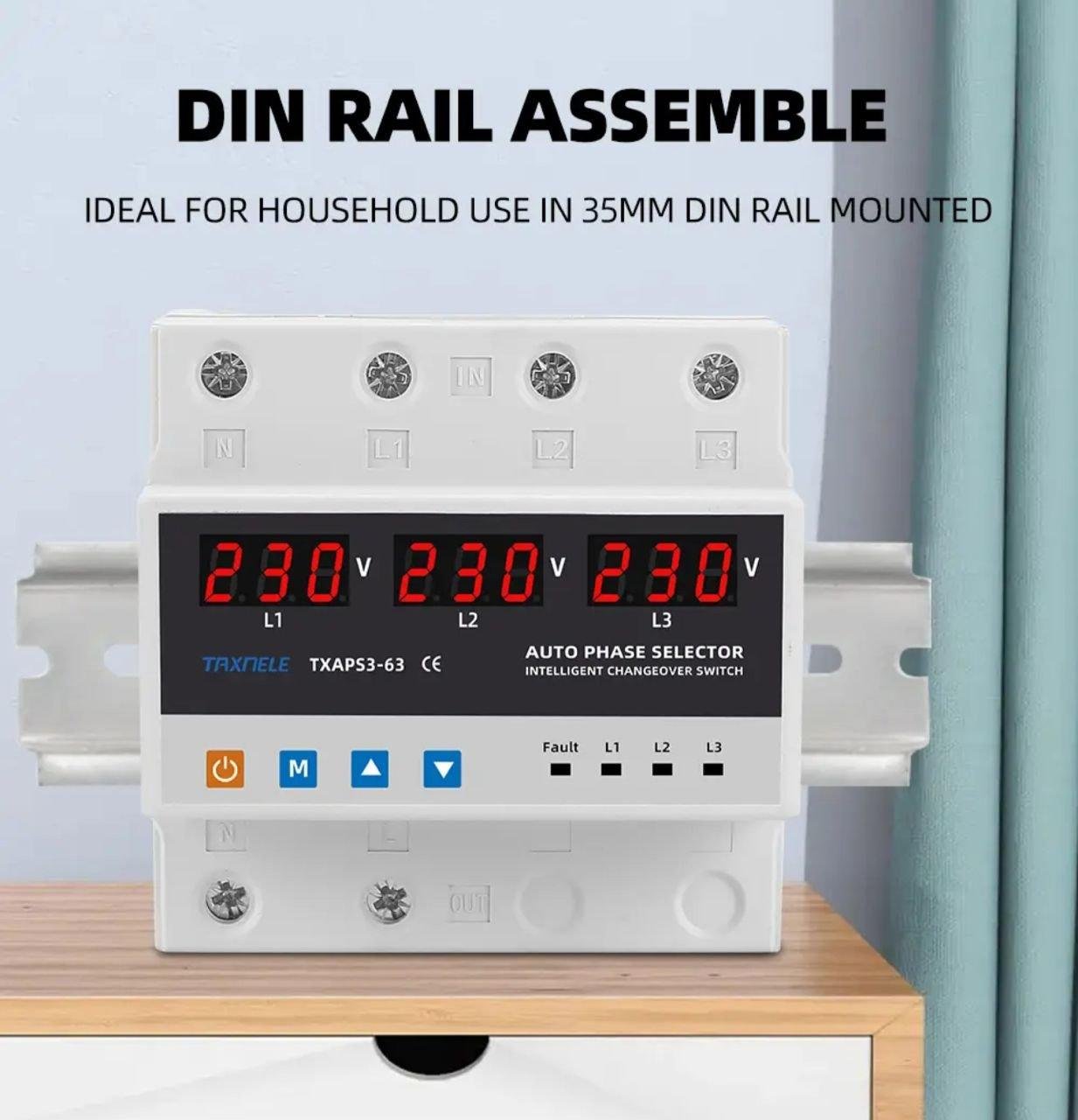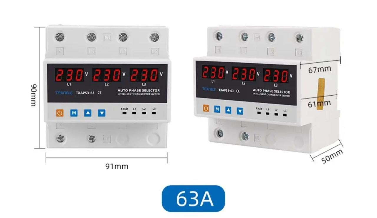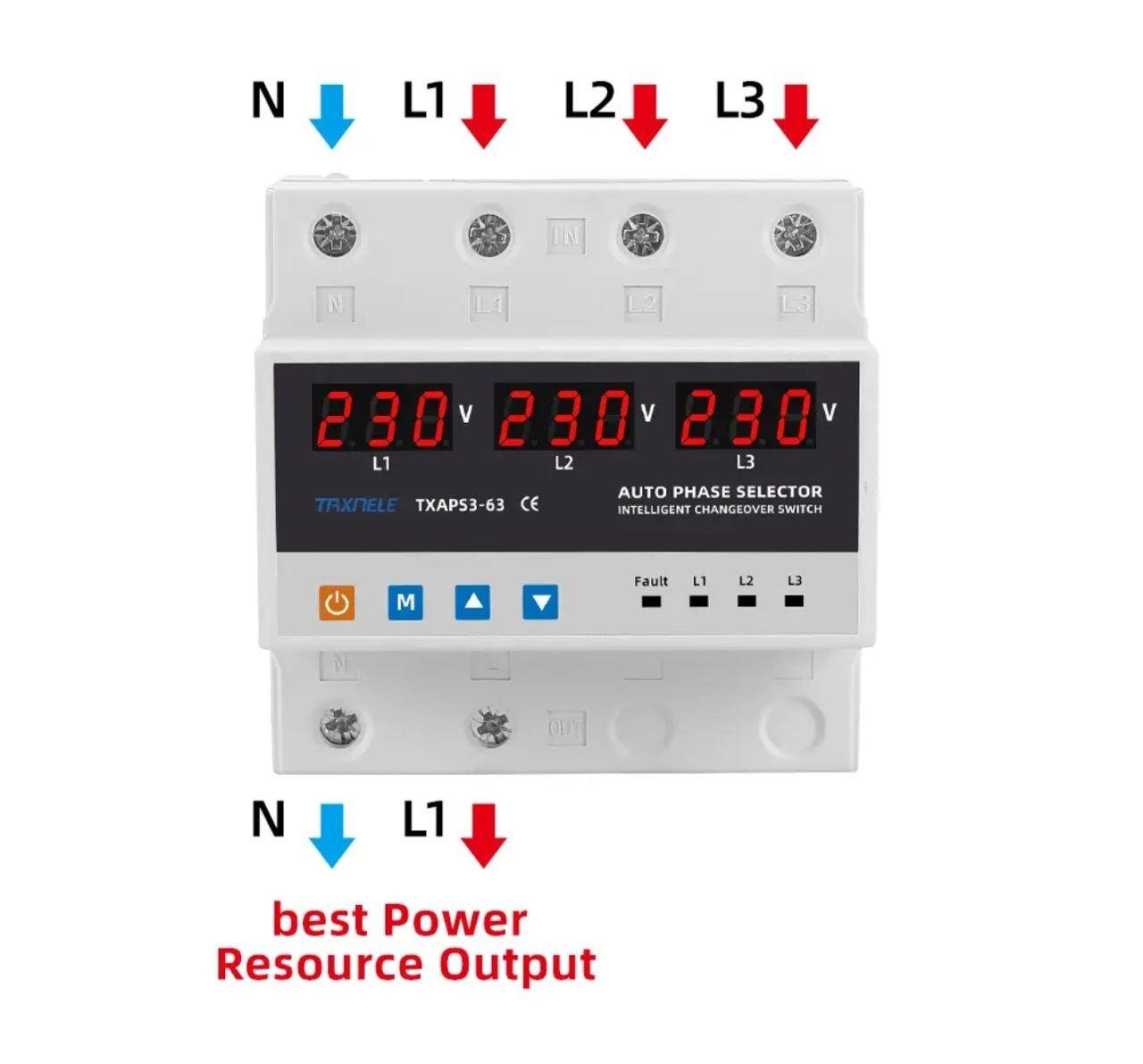 This 220V single-phase phase selector has been designed to power a single-phase load from a three-phase power supply, in order to maintain uninterrupted power supply. Depending on the presence and quality of the voltage on the phases, it will automatically select the optimal power phase and switch the single-phase load supply to it.
